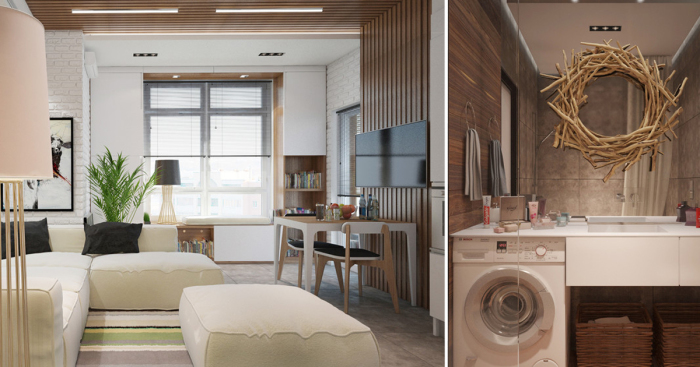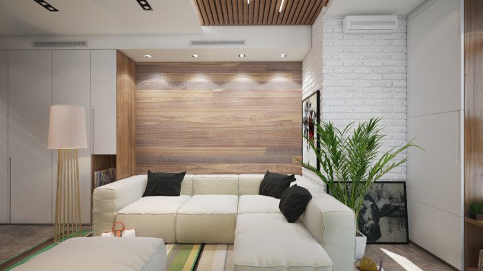 Площадь этой квартиры всего 29 квадратных метров, и дизайнеры решили сделать из нее студию. Благодаря использованию натуральных материалов и нейтральных цветов апартаменты получились очень светлыми, уютными и функциональными. Белый кирпич и теплое деревянное покрытие идеально соответствуют современным тенденциям. При этом данные материалы уже давно стали классикой и много лет подряд не выходят из моды. Необычные торшеры (напольная лампа со светлым абажуром и настольная — с темным) на бамбуковых ножках тоже подчеркивают эко-стиль интерьера.