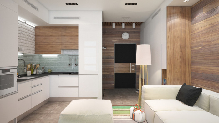 Обеденная зона выделена полосой деревянных планок, которая пересекает стену и продолжается на потолке со встроенной подсветкой. Кухонный гарнитур с белым фасадом является очень компактным и функциональным, мебель отлично гармонирует с деревянными элементами в декоре интерьера. Даже в оформлении входной двери дизайнеры не обошлись без дерева, которое на черном матовом полотне смотрится очень стильно.