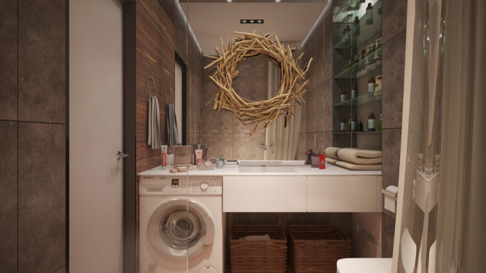 Санузел совмещен и занимает всего 4 квадратных метра. При этом в нем помещается ванная, унитаз, раковина, стиральная машина и стеклянный стеллаж для различных туалетных принадлежностей. Изюминкой ванной комнаты является полноразмерное зеркало с круглой рамкой из дрифтвуда — морских коряг уникальной формы. А для того, чтобы сделать маленький санузел более уютным, можно воспользоваться этими 7 простыми советами.