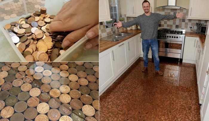 36-летний англичанин Мэтт Джайлс с гордостью демонстрирует в социальных сетях новый пол, сделанный своими руками. Издалека он выглядит шикарнее, чем паркет, но на самом деле пол сделан из обычных монет.